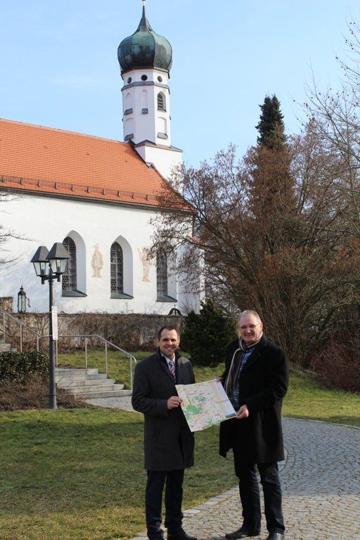 Die 1. Bürgermeister Stefan Kumpf, Gemeinde Karlskron und Manfred Russer, Markt Hohenwart freuen sich über die gemeinsame Wanderkarte. (Foto: Halbich)