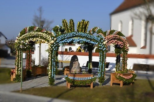 Wieder mit mehr als 5000 in aufwändiger Handarbeit bunt bemalten Eier von Hühnern, Gänsen, Straußen und Emus lockt der „Osterbrunnen“ viele staunende Besucher auf dem Pörnbacher Kirchplatz, wo dieses Kunstwerk nur kurze Zeit zu bewundern ist.