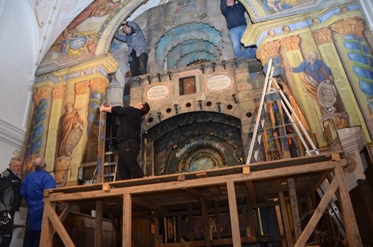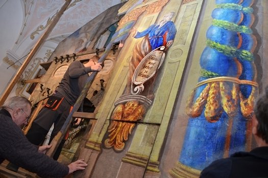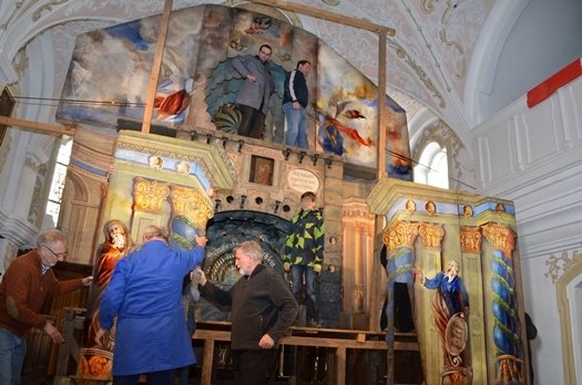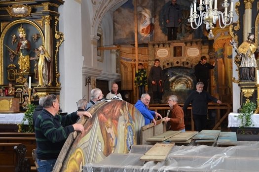 Das „Heilige Grab“ ist ein 7 mal 8 Meter großes Kunstwerk aus der Barockzeit und wurde anno 1717 in einer Werkstatt des damaligen Klosters Geisenfeld angefertigt. Vier Jahre später wurde es erstmals aufgestellt und Anziehungspunkt der Gläubigen. Es stellt den Tod, die Grablegung und Auferstehung von Jesus dar. Erst vor fünf Jahren wurden die empfindlichen Leinwände restauriert. Da hieß es heute aufpassen bei den mehr als zwei Dutzend mit dem Aufbau Beschäftigten aus dem Kreis des Baarer Pfarrgemeinderates und weiteren Unterstützern der Ortsteile Baar und Ebenhausen, damit das empfindliche Material - übers Jahr lagert es in einer Art Speicher im Kirchenschiff - nicht zu sehr in Mitleidenschaft genommen wird. Einen ganzen Tag benötigten die Männer dazu. Am späten Nachmittag waren die Einzelteile dann zusammengesetzt und die Elektronik konnte von Max Menzel installiert werden. Zu früheren Zeiten waren noch Kerzen zur Beleuchtung verwendet worden. Feuerwachen wurden benötigt und ein Eimer Wasser stand zum Löschen stets bereit. Das aber ist Vergangenheit.