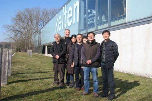 Im Rahmen einer Europa-Reise nahmen sich sechs Professoren und Dozenten von mehreren Universitäten in Südkorea einen ganzen Tag Zeit, um zusammen mit Museumsleiter Dr. Wolfgang David das Museum und das Oppidum Manching zu besichtigen. Geleitet wurde die Gruppe aus Ostasien von Professor Kim Yong-Il von der Universität Seoul. Für diesen bekannten Spezialisten (2. von rechts auf dem Foto) war es bereits der dritte Besuch des kelten römer museums: 2009 hatte er mit seinen südkoreanischen Studenten das Museum besucht, 2011 war er extra wegen der einzigartigen Ausstellung „Aenigma“ über die Brotlaibidole nach Manching gekommen. Als ausgewiesener Spezialist für die Archäologie der Bronzezeit steht er seit etwa 20 Jahren in regelmäßigem wisschenschaftlichen Kontakt mit Museumleiter Wolfgang David. Damals unterstützte er Kim Yong-Il bei der Bewerbung um ein Forschungsstipendium in Bayern. Diesmal hatte Dr. David den Kontakt zu einem der Partnermuseen des kelten römer museum vermittelt, so dass die Gäste aus Südkorea das Museum und Archäologiezentrum im französischen Bibracte besuchen und mit dem dortigen Generaldirektor Vincent Guichard zusammentreffen konnten. Dabei wurde auch über eine mögliche Kooperation zwischen Bibracte, Manching und den südkoreanischen Institutionen im Rahmen einer Sonderausstellung gesprochen. So könnten möglicherweise in drei bis vier Jahren archäologische Schätze aus Korea in Bibracte und Manching zu sehen sein. Das kelten römer museum würde damit geographisch an die erfolgreiche Sonderausstellung "Steppenkrieger" des Jahres 2013 mit Funden aus der Mongolei anknüpfen und sogar noch weiter nach Fernost ausgreifen.