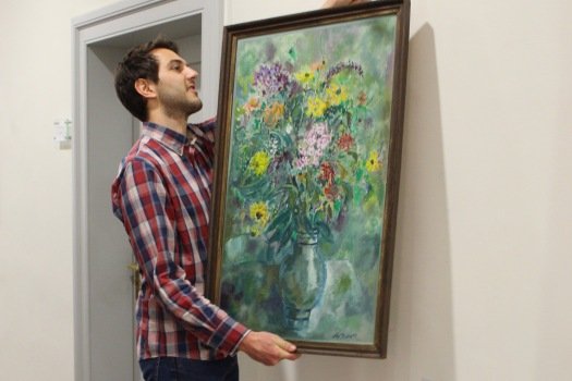 Fabian Langenecker, Praktikant der Kulturabteilung der Stadtverwaltung Pfaffenhofen, hängt das Ölbild „Blumenstrauss“ von Siegfried Braun in die Ausstellung. Foto: Laura Roith