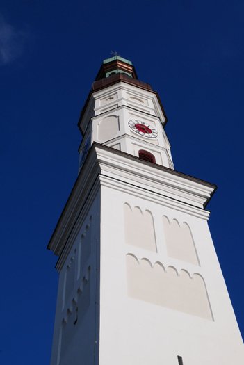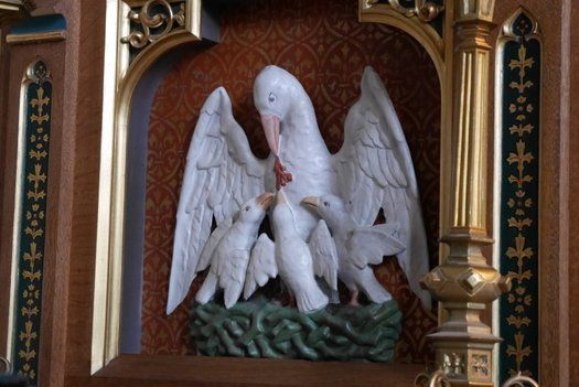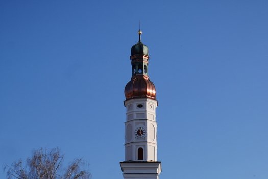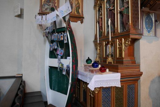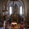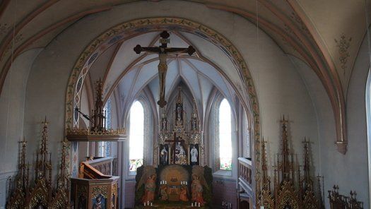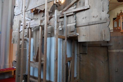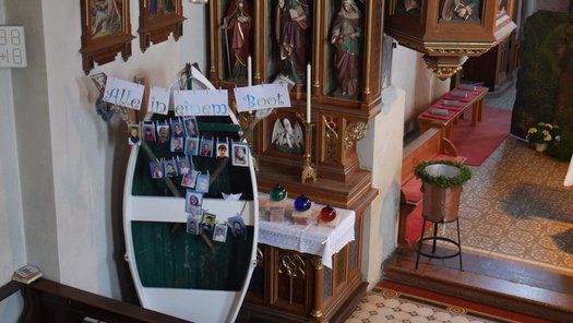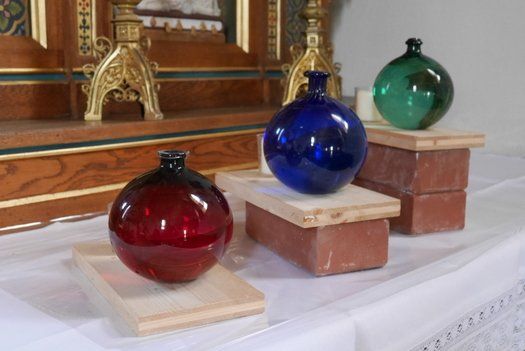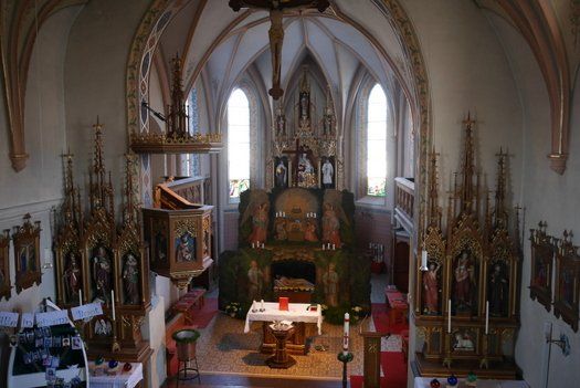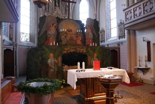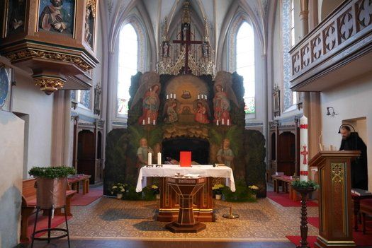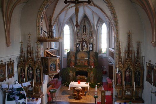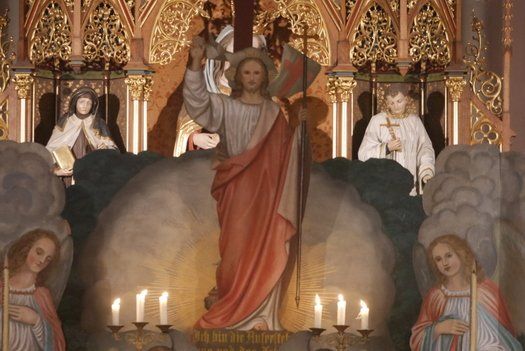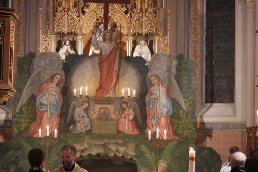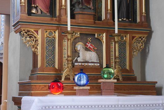 Bunte, mit Kerzen hinterleuchtete Glaskugeln aus Scheyerer Inventar ergänzten in der Osternacht das Gesamtbild in der Kirche. Durch eine einfache Mechanik lässt sich der Auferstandene aus der Tiefe ans Licht heben, der Leichnam in der Gruft verschwindet nach unten und gibt den Blick auf die leere Höhle frei. In den Feiertagen ist die Kirche auch für Besucher geöffnet und man kann vielleicht auch einen Blick auf den freigelegten Fußboden werfen, der sonst von einem Teppich bedeckt wird. Eine ganz besondere Geschichte ist auch die Darstellung der Heiligen Maria im Hauptaltar, die dem Jesuskind einen Apfel reicht. Roland Gronau hatte auch einen Apfel dabei, den er als Symbol einem jungen Besucher schenkte. Es gibt als Brauch übrigens den Osterapfel, er musste vor dem Frühstück gegessen werden - man sollte dann das ganze Jahr keine Zahnschmerzen oder Fieber bekommen.