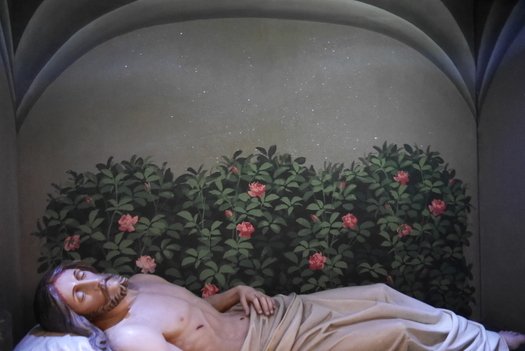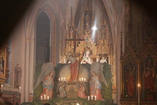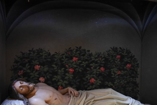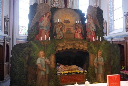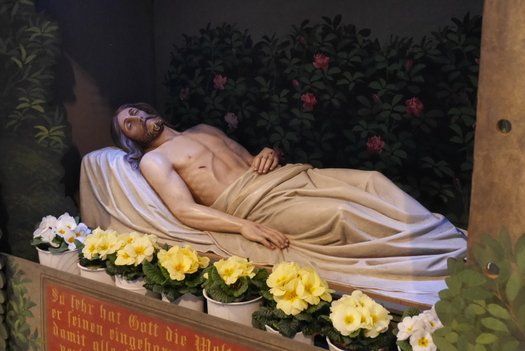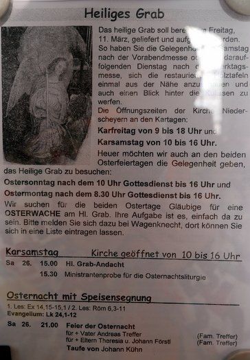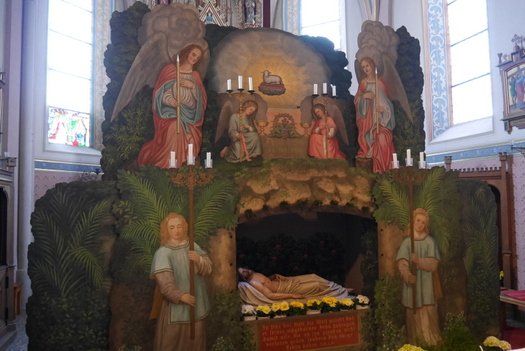 Schon am Nachmittag kamen viele Pfaffenhofener, um das Heilige Grab in Mariä Verkündigung zu bestaunen. Durch eine beeindruckende Anstrengung ist es gelungen, den Urzustand des 100 Jahre alten Kunstwerkes wiederherzustellen. Um die 13 000 Euro hat die Diözese mit der Gemeinde investiert, nachdem klar war, dass die Niederscheyerer ihr wiedergefundenes Ostergrab haben wollten. Der Restaurator hat sogar die Innenseite der Grablege mit einem raffinierten Glassplitterüberzug (zerriebene Glühbirne und Lack) wiederbelebt. Die Seitenteile wurden zwar optisch aufbereitet, doch die feuchtigkeitsbedingte Wölbung wehrte sich. Im Gesamtbild mit Kerzenschein und Oberbeleuchtung gewinnt die Konstruktion durch eine neue Dreidimensionalität.