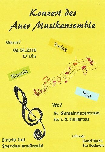 Am Sonntag, den 3. April 2016 findet um 17.00 Uhr im Evangelischen Gemeindezentrum in Au/Hallertau ein Konzert von musikbegeisterten Kindern und Erwachsenen von Klassik über Swing zu Pop unter Leitung von Lionel Roche und Eva Hochwart statt.