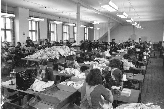 Der große Nähsaal nach der Umgestaltung in den 1950er Jahren (Firmennachlass Deutsche Blaudruck)