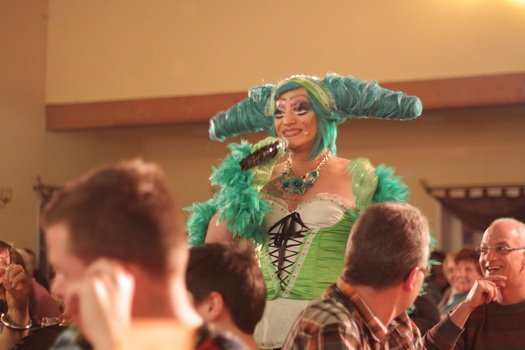 Wie kaum ein live act verstehen es die Travestiekünstler das Publikum mit einzubeziehen. Und das macht euphorisch mit. Die Stimmung im Saal steckt auch die Künstler an: Backstage feiern die Grazien das klatsch- und pfeifwütige Publikum, wie die Zuschauer ihre Grazien. „Es macht so viel Spaß mit den Leuten, die nächste Weihnachtsshow hier drin ist schon mal sicher“, sagt Jaqueline. Mittlerweile haben sie sich eine recht angenehme Spieldichte erarbeitet. Die letzten Monate traten sie vor allem in Niederbayern und München auf, neue Spielstätten werden aber gesucht. Und sie feilen immer weiter an der Show: „Wir schauen was funktioniert und was jedem liegt. Jede hat ihre Talente“. Und sie alle können Stimmung machen – so viel, dass es sogar sie selbst aus dem Konzept bringt. Die herrlichen Grazien sind ganz nah am Zuschauer. So holt Veranstalterkollege Werner nach der Show den jüngsten Gast nochmal zum Playback-Schlager-Singen auf die Bühne, während die Grazien sich schon zum Autogramme schreiben und Fotos machen unters Volk mischen, das es nicht gerade eilig hat, nach Hause zu kommen. Mehr Stimmung, mehr Gaudi, mehr Unterhaltung geht nicht.