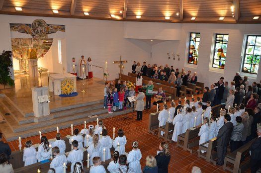 Mit Gläubigen voll besetzt war am heutigen Sonntag die Pfarrkirche St. Katharina als die Erstkommunionkinder aus Langenbruck, Hög und Puch dort am Nachmittag zum Dankgottesdienst zusammenkamen. Pfarrer Michael Schwertfirm begrüßte in dem Langenbrucker Gotteshaus rund 30 Kommunion-Kindern und deren Eltern, Freunden und Angehörigen.