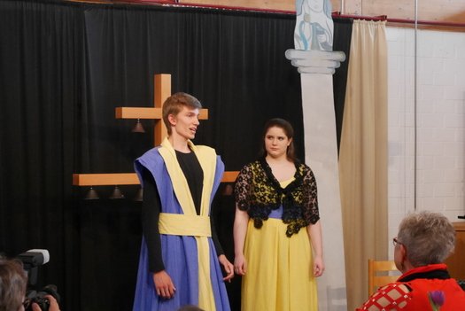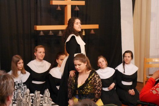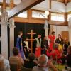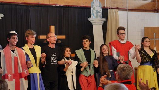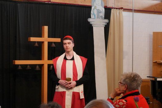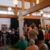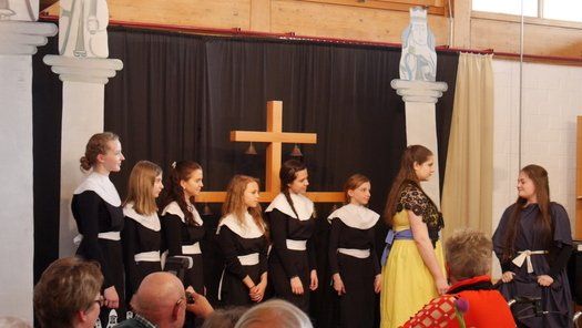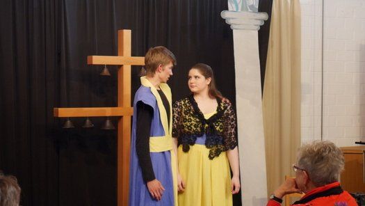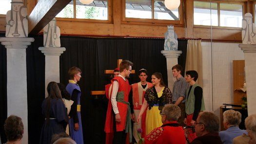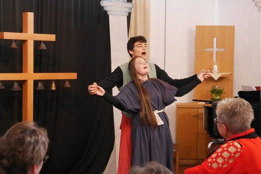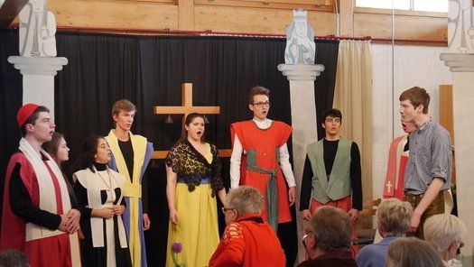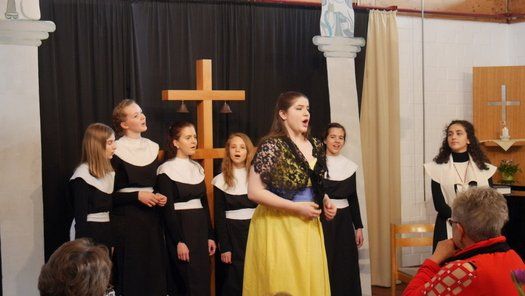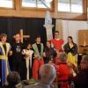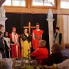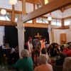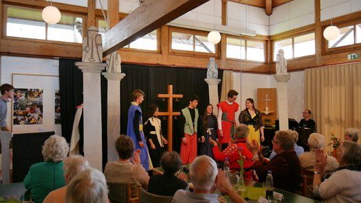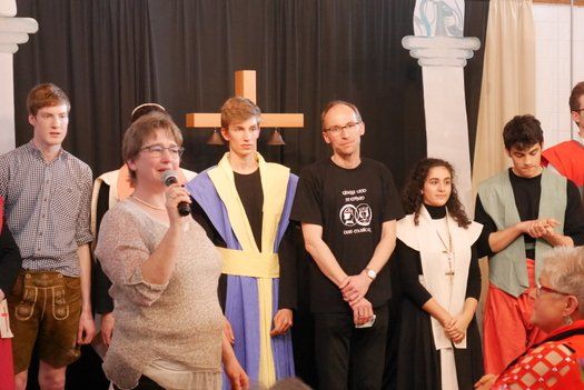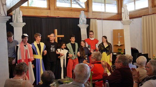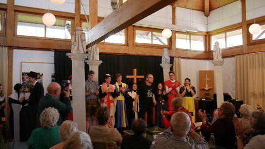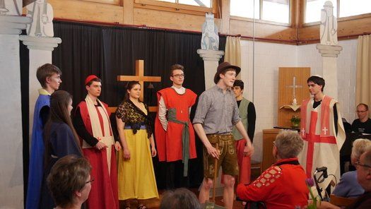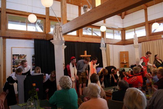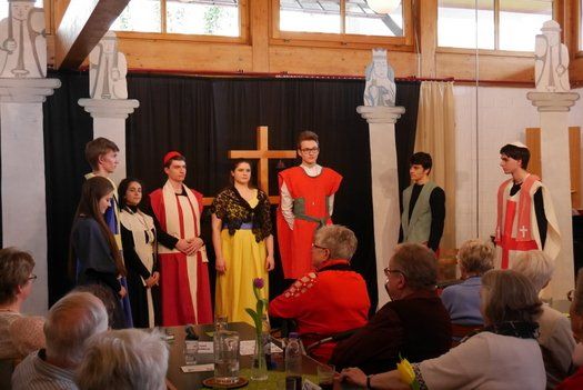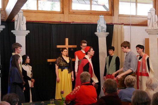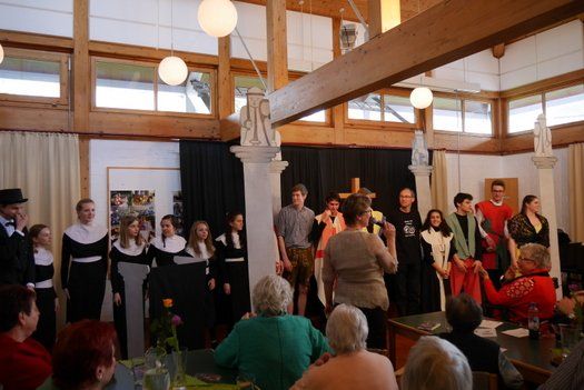 Kleine Eigenheiten, wie ein Erzähler der tatsächlich im Mittelalter ein Handy einsetzt, oder ein bayerischer G´stanzlsänger in Tracht, der den Oberen in Versform den Spiegel vorhält, Regieeinfälle, die die manchmal anstrengenden, weil in fremder Sprache gesungenen Passagen, gut auflockern. Die Senioren waren durch die Bank begeistert und die Sängerinnen und Sänger hatten erstmals die Gelegenheit, ihre neue Produktion vor Publikum auszuprobieren. Stefan Daubner am Klavier begleitete nicht nur, teilweise sang er sogar eine einzelne Rolle laut mit. Wie das Ganze dann mit großem ungarischen Chor und entsprechender Bühnenpräsenz wirkt, war auf jeden Fall schon zu erahnen. Eine großzügige Spende der Gemeinde an diesem Nachmittag hilft auf jeden Fall, die gestiegenen Kosten für die Ungarnreise etwas zu dämpfen.