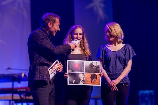 von links: Markus Othmer, Moderator der Ehrungsveranstaltung "hero", mit Landessiegerinnen Kurzfilm Nicola Achatz und Alexandra Pfab