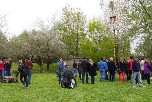 MaiBaumAufStellen für ALLE! im InterKulturGarten am Heimgartenweg, der Arbeitskreis Inklusion Pfaffenhofen an der Ilm hatte in den Garten der Begegnung geladen und viele Freunde kamen. Ein interkulturelles Maibaum-Fest mit Mitbring-Picknick bei lange trockenem Wetter.