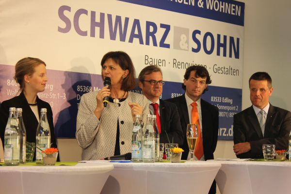 Die Podiumsteilnehmer von links nach rechts: Sybilla Freudenmacher, Horst Pinsker, Peter Hintermeier, Hans Zirngibl, Hans Bachner, Isar TV Moderatorin Verena Maier, Staatsministerin Ilse Aigner, Christian Amann, Dieter Scholz und Gastgeber Klaus Sperling