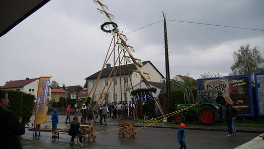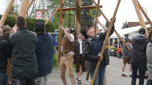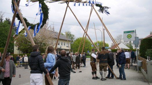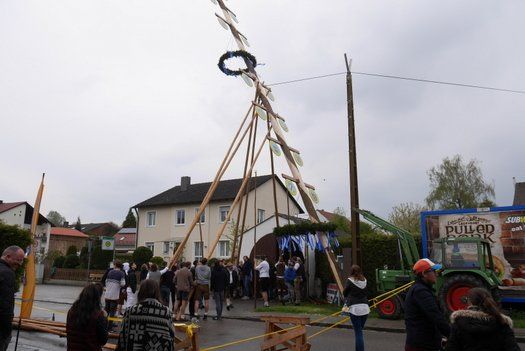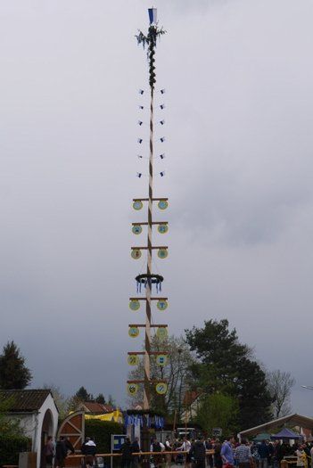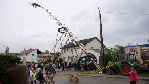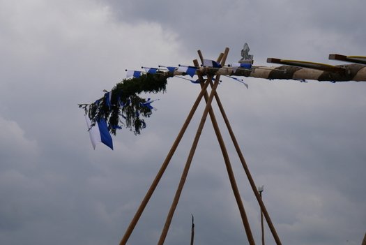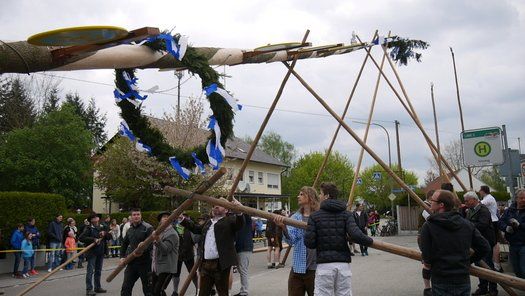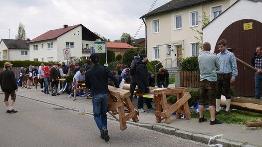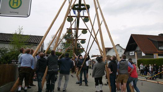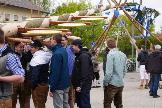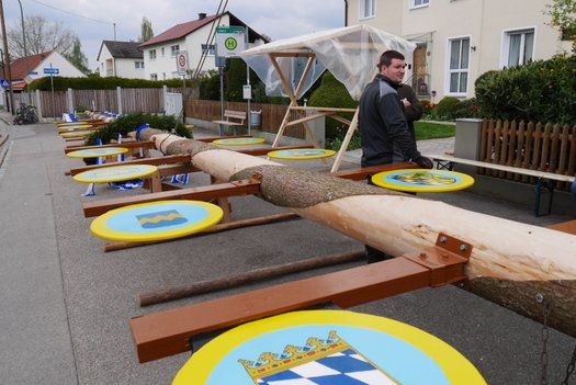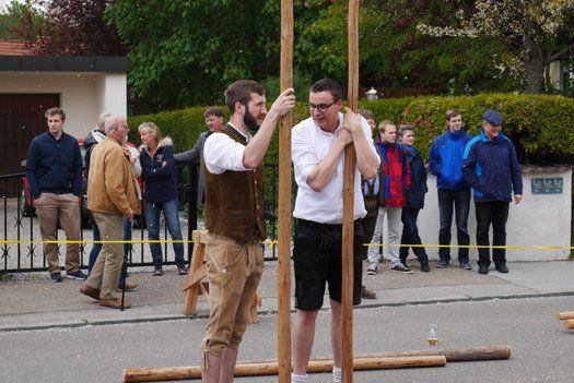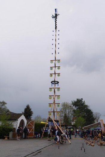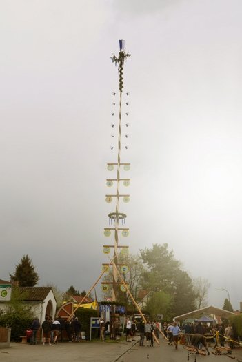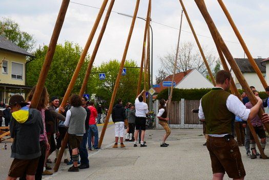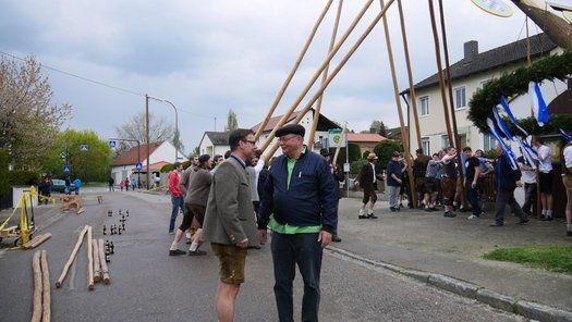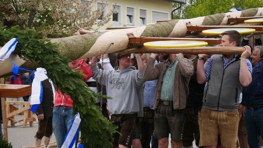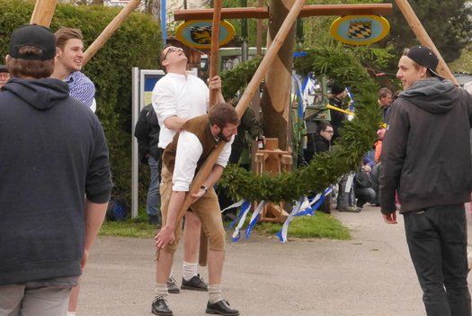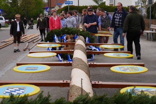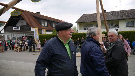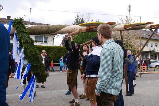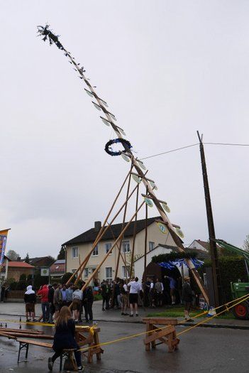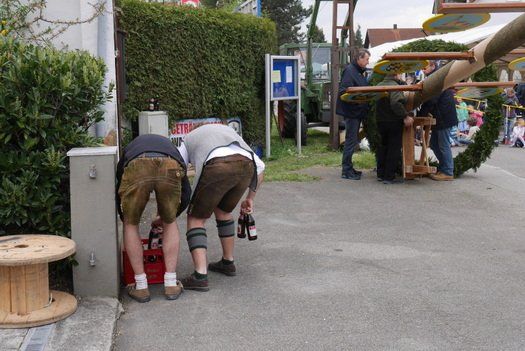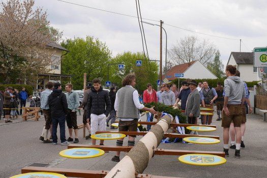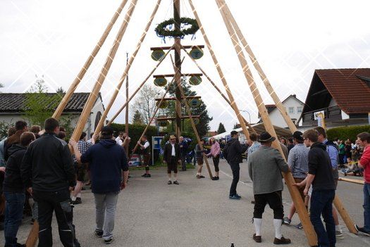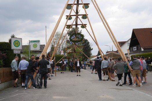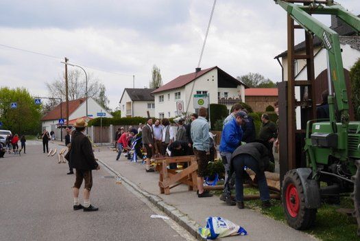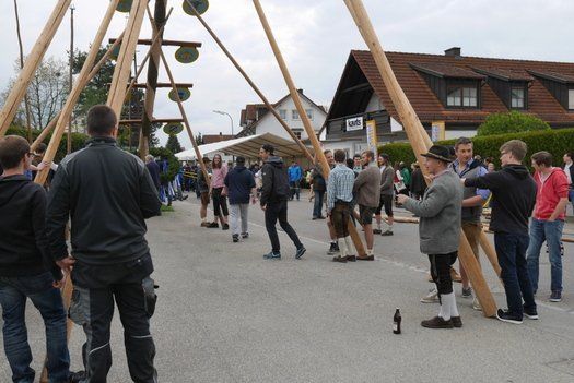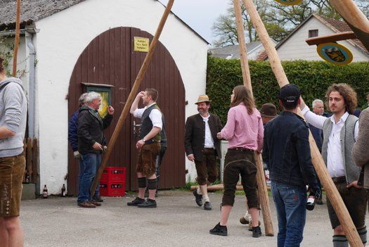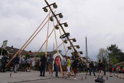 Früher durften nur unverheiratete, junge Männer Hand an die Stangen legen die den Baum Schritt für Schritt von der Waagrechten in die Senkrechte brachte. Stangenhalter oder „Vögler“, das sind die Mannen mit den Hilfsstangen, deren eiserner Haken wie ein Vogel im Flug ausschaut, anscheinend gibt es auch innerhalb der Maibaumgemeinschaft eine Hierarchie. Jedenfalls folgt das Ritual am 1.Mai festen Gesetzmäßigkeiten, die sich nur dem Eingeweihten erschließen. Die Menge und Marke des flüssigen Kraftstoffes, der natürlich umsonst und entsprechend gekühlt, im alten Feuerwehrschuppen bereit steht, ist wichtig, genauso wie die Zuordnung zur Kirchenseite oder Straßenseite.