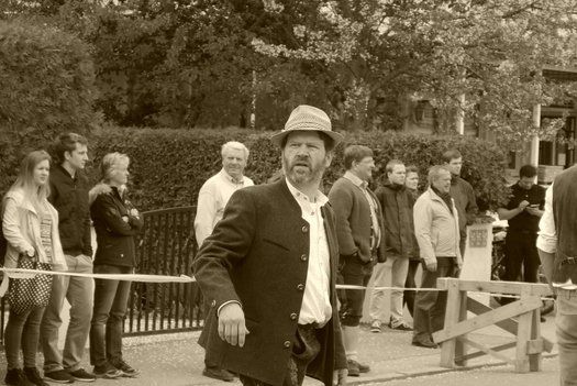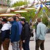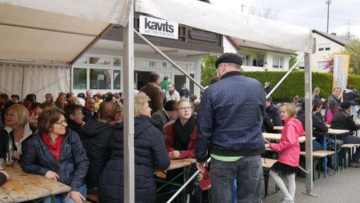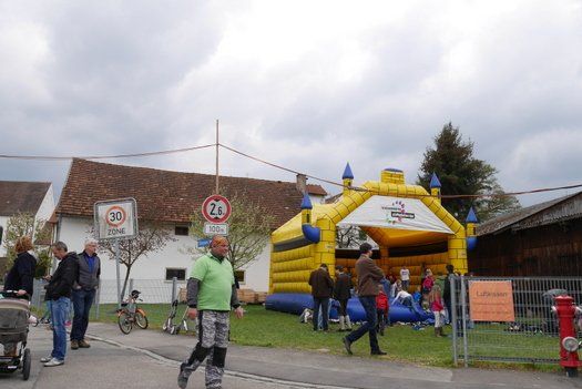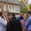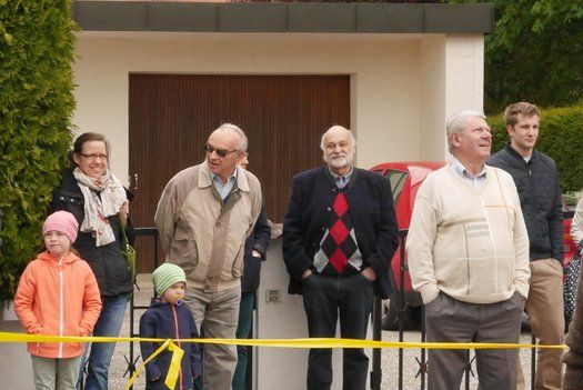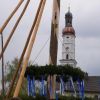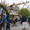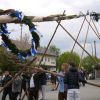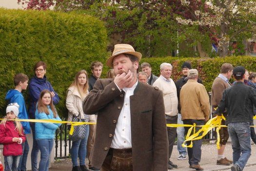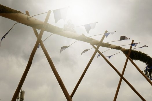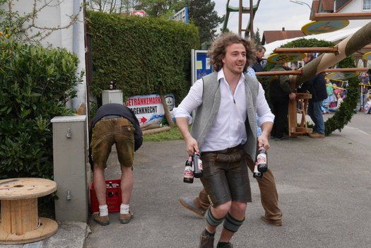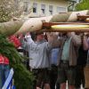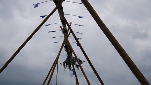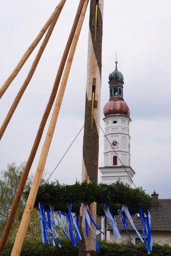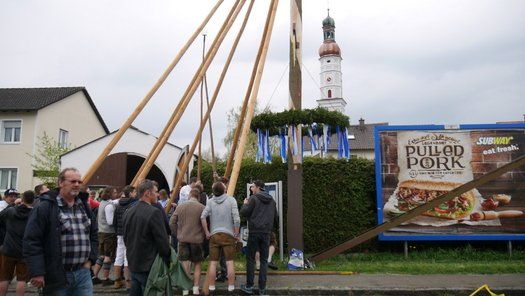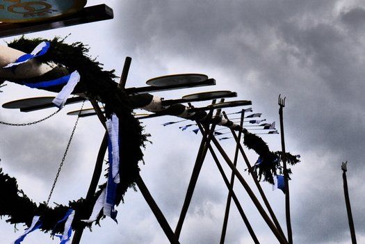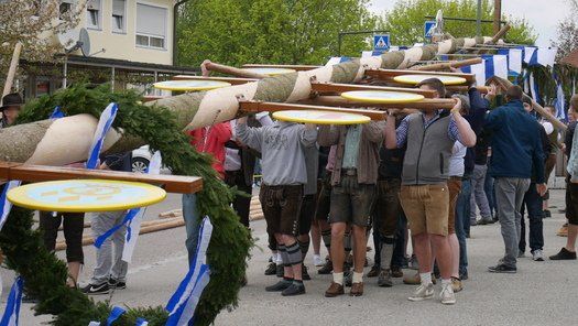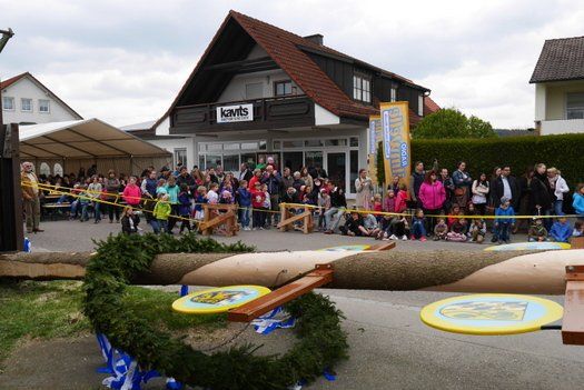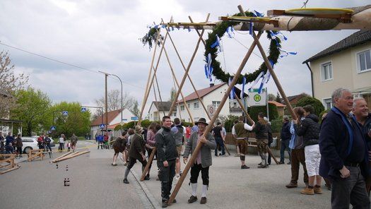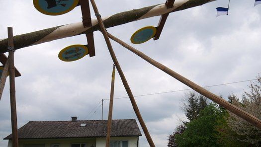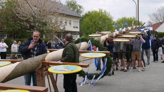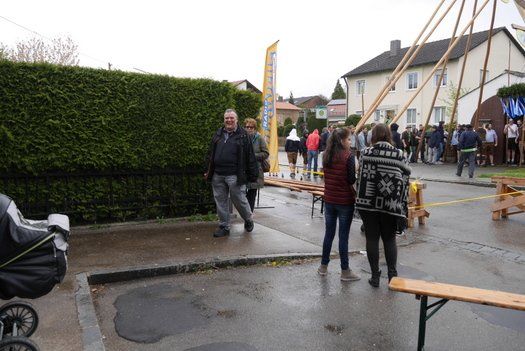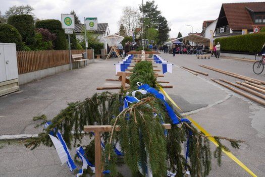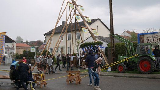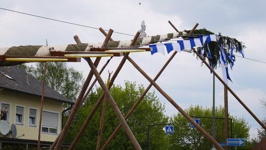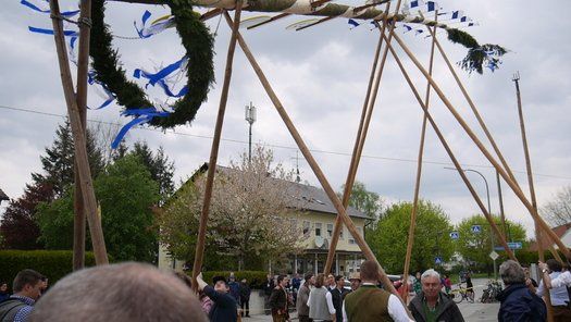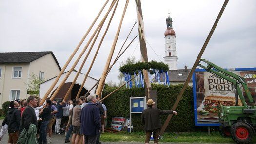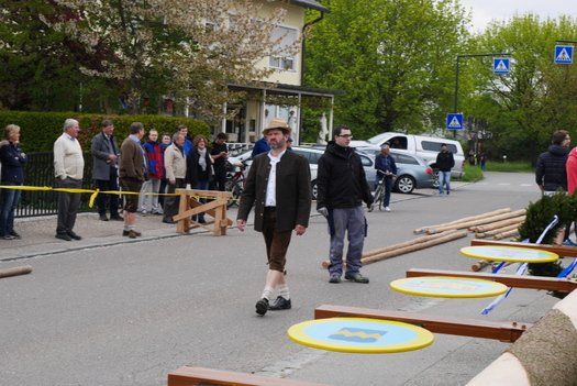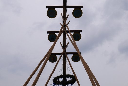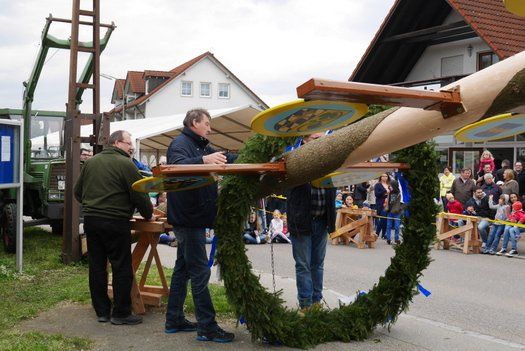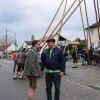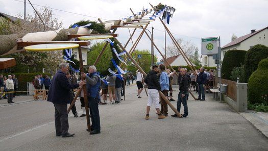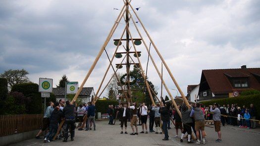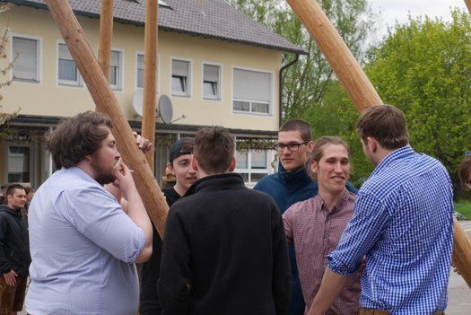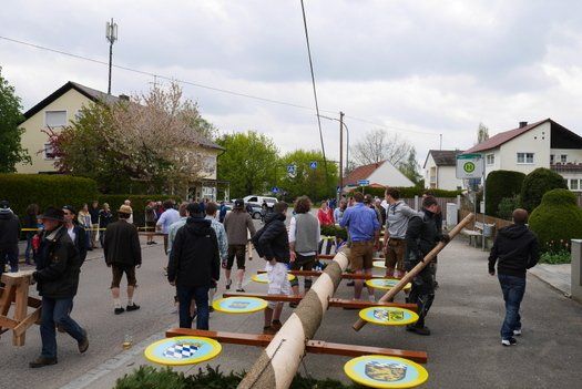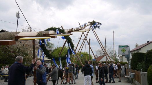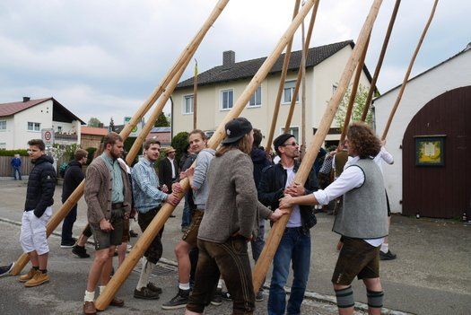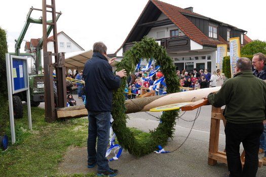 Früher durften nur unverheiratete, junge Männer Hand an die Stangen legen die den Baum Schritt für Schritt von der Waagrechten in die Senkrechte brachte. Stangenhalter oder „Vögler“, das sind die Mannen mit den Hilfsstangen, deren eiserner Haken wie ein Vogel im Flug ausschaut, anscheinend gibt es auch innerhalb der Maibaumgemeinschaft eine Hierarchie. Jedenfalls folgt das Ritual am 1.Mai festen Gesetzmäßigkeiten, die sich nur dem Eingeweihten erschließen. Die Menge und Marke des flüssigen Kraftstoffes, der natürlich umsonst und entsprechend gekühlt, im alten Feuerwehrschuppen bereit steht, ist wichtig, genauso wie die Zuordnung zur Kirchenseite oder Straßenseite.