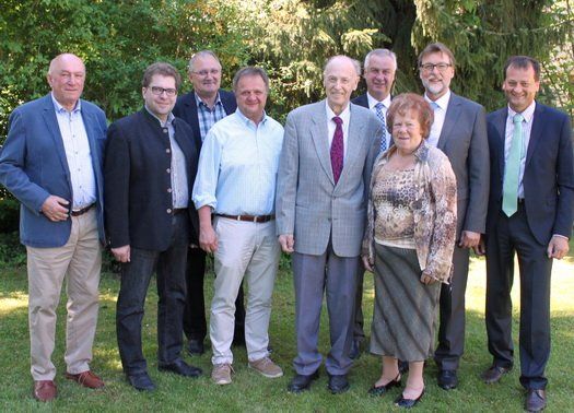 Eine Delegation von Mandatsträgern und ehemaligen Weggefährten rund um Landrat Martin Wolf (2.v.r.) gratulierten Altlandrat Dr. Traugott Scherg (5.v.r.) zum 80. Geburtstag; Foto: Huber