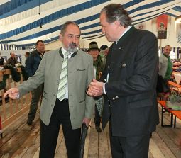 Festwirt Claus Soller organisierte kurzer Hand einen Shuttlebus, der die Ehrengäste und Besucher zum Festplatz brachte. Dort zapfte Bürgermeister Karl Ecker in Vertretung von Landrat Josef Hauner, der verhindert war, gekonnt mit 2 Schlägen das erste Fass an. Zusammen mit Brauereibesitzer Michael Beck Freiherr von Peccoz, dessem Braumeister, Vizehopfenkönigin Helena Kreitmair und Vizelandrat Robert Scholz, der etwas Verspätung hatte, wurde der erste Schluck des Festbieres unter der Begleitmusik der "Holledauer Hopfareisser" verköstigt. Leider waren heuer, wohl auf Grund des schlechten Wetters, nicht nur weniger Ehrengäste sondern auch kaum Besucher dabei.