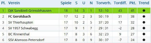 Ein Blick auf die Tabelle (Grafik: Bayerischer Fußballverband) zeigt: Sollte Spitzenreiter Sandizell sein Spiel am kommenden Samstag gegen den Tabellendritten SV Thierhaupten gewinnen, dann wären die Gerolsbacherinnen wegen des Aufstiegsverzichts der Konkurrentinnen bereits an diesem Wochenende ohne eigenes Zutun nicht mehr vom zweiten Platz zu verdrängen. Bewundernswert ist die Serie des Teams nach der Winterpause: aus 12 Spielen ging man - frau? - 10mal als Sieger vom Platz, es gab dabei lediglich ein Unentschieden und eine knappe Niederlage. Mit dem Aufrücken der U17-Juniorinnen in der nächsten Saison - ebenfalls enorm erfolgreich in der Bezirkslga - sieht sich der Verein bei einem Kader von dann um die 25 Damen sehr gut aufgestellt für das Abenteuer Bezirksliga.