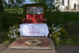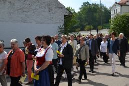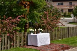 Beim ersten von den vier Altären im Ort wurde am Maibaum Halt gemacht mit Gebet und Gesang. Weiter ging es dann einmal im großen Kreis durch den Ort zu den restlichen drei Altären, die alle schön hergerichtet waren. Die letzte Station war dann direkkt unterhalb der Kirche. Nach dem Abschlussgebet gab es für die vielen Gläubigen am Feuerwehrhaus Herzhaftes aus der Wurstkuchel, denn Weißwurst schmeckte allen am frühen Vormittag.