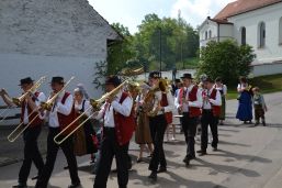 Es folgten die Fahnenträger mit der Blaskapelle, die Kommunionskinder und Ministranten, gefolgt von Pater Johann mit der Monstranz. Dahinter zog sich der lange Prozessionszug der Gläubigen durch die Straßen des Ortes.