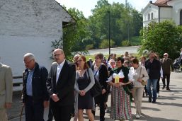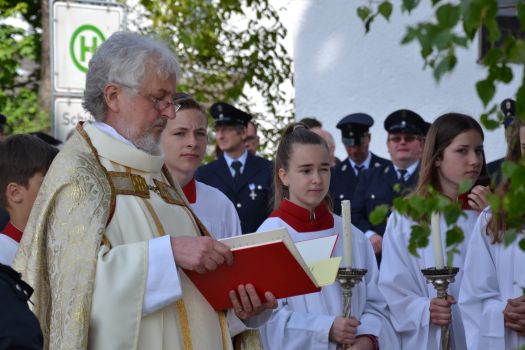 Gegen Ende des Festgottesdienstes hatten draußen bereits die Mitglieder der Rohrbacher Blaskapelle gewartet und die Kirchenbesucher aus allen Ortsteilen formierten sich anschließend nach dem Gebet zum Prozessionszug vor der Kirche, angeführt vom Kreuzträger.