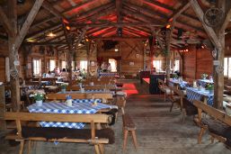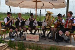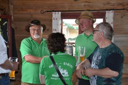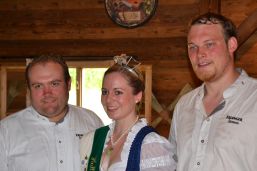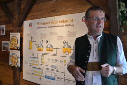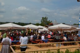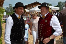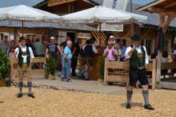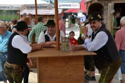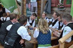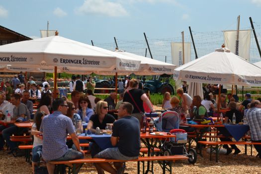 Die Erwachsenen hielten sich lieber unter den großen Sonnenschirmen auf, tranken ihr Weißbier oder alkoholfreie Getränke. Sie konnten sich aber auch in einer der aufgebauten Hütten von Braumeister Josef Ernst von der Weißbierbrauerei den Herstellungsprozess des Bieres erklären lassen. Und wer einmal Probleme zu Hause oder auf seinem Hof haben sollte, weil vielleicht die Bäuerin mal ausfallen sollte, war sicher dankbar für die Informationen, die Erna Schmidmeir als Mitarbeiterin des Maschinenringes Ilmtal lieferte, da sie aus ihrer umfangreichen Praxis im Interview mit Studiotechniker Nullinger viel darüber erzählen konnte, in welchen Funktionen sie immer wieder zum Einsatz in solchen Fällen kommt. Auch die Goaßlschnalzer und Alphornbläser hatten bei dem schönen Wetter viel mehr Spaß als im Regen. Und wen der Huger packte hatte eine große Auswahl, er konnte wählen zwischen Grillhähchen, Brat- und Weißwurst, Schmalznudeln, Kaffe und Kuchen oder Kaiserschmarrn und natürlich Schweinsbraten mit Knödel und Kraut. Die meisten Gäste verbrachten so im Schnitt drei bis vier Stunden im Weißbierdorf, auch wenn einigen die Hitze gelegentlich zu viel wurde - in die große Weißbierhütte gingen sie dann aber trotzdem nicht, denn die war fast die meiste Zeit total leer.