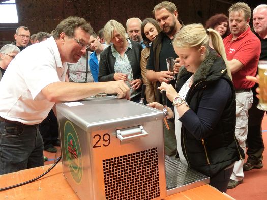 An 4 aufgebauten Bierfässern konnte unter fachlicher Anleitung von Basti Kleespieß, dessen Frau Ingrid, Bernhard Nieder und Thomas Stein das richtige Einschenken geübt werden. Wertvolle Tips halfen schließlich, dass die kleinen, gläsernen Bierkrügerl richtig gefüllt und mit ordentlichem Schaum versehen wurden.