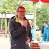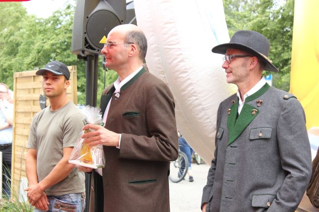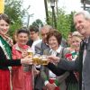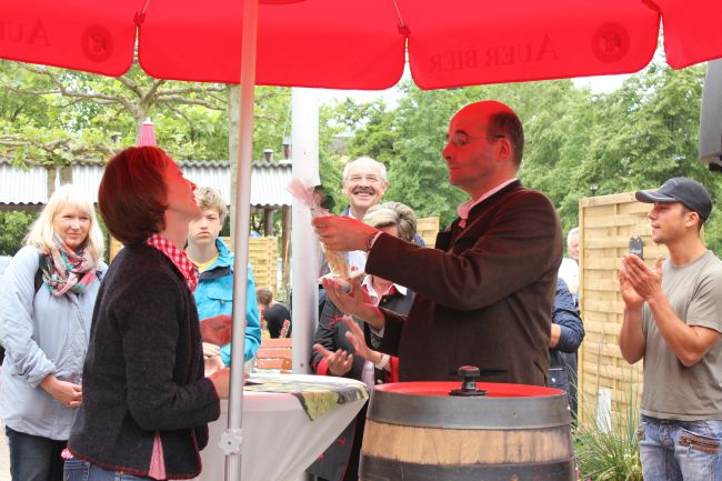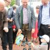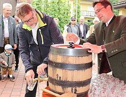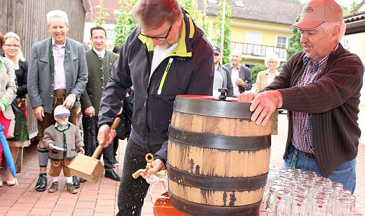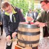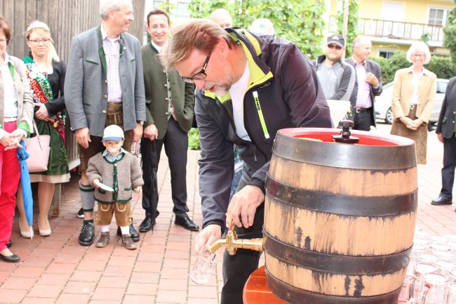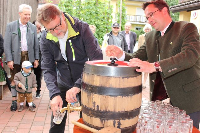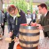 Landrat Wolf beim Anzapfen eines frischen Fasses – ein schwieriges Unterfangen… erst beim 3. Mal klappt´s.