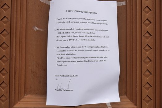 Alles bar bezahlt und selbstständig mitgenommen, das übriggebliebene Radl kommt wie die restlichen 50 Fundbikes, die mehr oder weniger nicht mehr funktionstüchtig waren, zu einer Gruppe Bastler, die sie für einen guten Zweck herrichten. Die Versteigerung bei strömendem Regen hatte doch an die 70 Interessierte angelockt, die sich bei manchen Teilen an die 80-Euro-Grenze hochschaukelten. Bei Startbeträgen zwischen 5,– und 20– Euro wurde in 2er-Schritten geboten, die der Bürgermeister mit durchaus bühnenreifen Sprüchen kommentierte. „Der Cannabisaufkleber bürgt für die Echtheit dieses Hollandrades“ etwa erhöhte den Preis schlagartig.