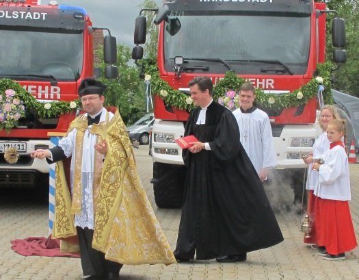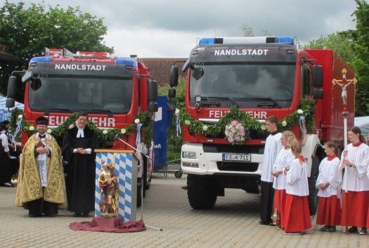 "De san hoid doch guad eigsamt, de Nandlstädter, die können sich gleich zwei neue Feuerwehrfahrzeuge leisten", so die Worte von Pfarrer Stephan Rauscher am Feuerwehrhaus am Ortsrand von Nandlstadt. Er übernahm zusammen mit dem evangelischen Pfarrer Julian Lademann die Segnung der beiden Fahrzeuge. Passt auf die Fahrzeuge auf, aber auch auf euch, lautete ihre Botschaft.