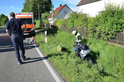 Eine 27-jährige Frau aus Karlskron stand währenddessen mit ihrem VW Caddy in der Autokolonne und wollte gerade wenden, als der Kradfahrer an ihrem Fahrzeug vorbeifuhr. Dabei kollidierte der Kradfahrer mit dem Pkw und stürzte zu Boden. Das Motorrad kam im Straßengraben auf der gegenüberliegenden Straßenseite zum Liegen. Der Kradfahrer erlitt nach ersten Vermutungen am Unfallort eine Schulterfraktur und wurde mit dem Rettungswagen in die Ilmtalklinik gebracht.