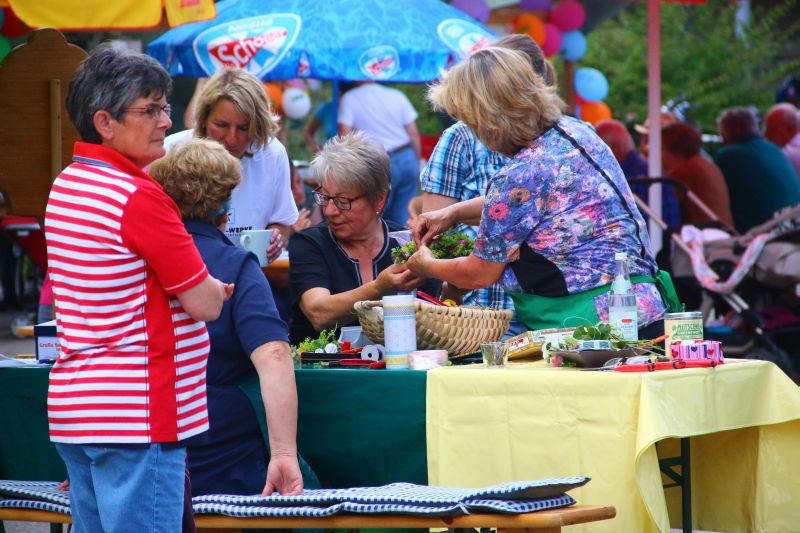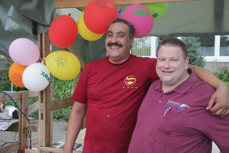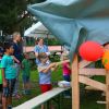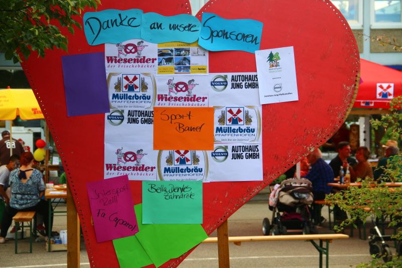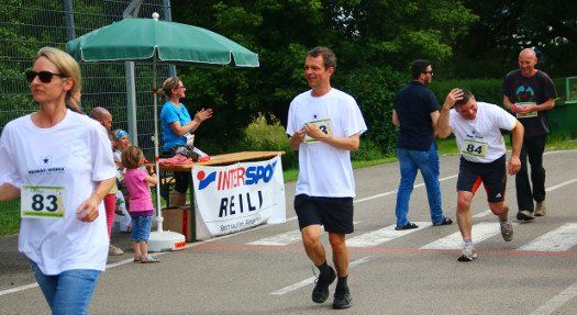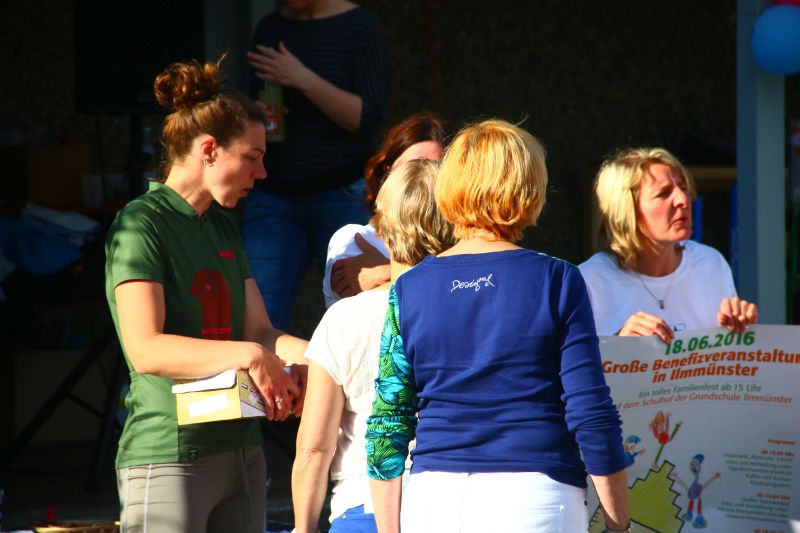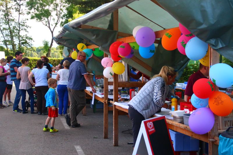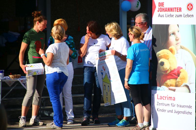 Und jetzt kommen die Englein ins Spiel: denn pünktlich zum Start des Spendenlaufs zeigte sich der weiß-blaue Himmel von seiner allerbesten Seite. 44 Kinder machten sich auf die für sie 750 Meter lange Runde, 59 teilnehmende Erwachsene hatten je Runde 2 Kilometer zu absolvieren, um sie angerechnet zu bekommen. Denn je Runde wurden von einer Sponsorengruppe 2 Euro für Lacrima gespendet. Die Kinder schafften alle gemeinsam 291 Runden, die Erwachsenen 306, was ein doch erkleckliches Sümmchen in die Spendenkasse fließen ließ. Hinzu kamen dann noch die Standgebühren für die Flohmarkttische und die Spenden der ortsansässigen Caterer, die für Speis' und Trank bei diesem Familienfest sorgten.