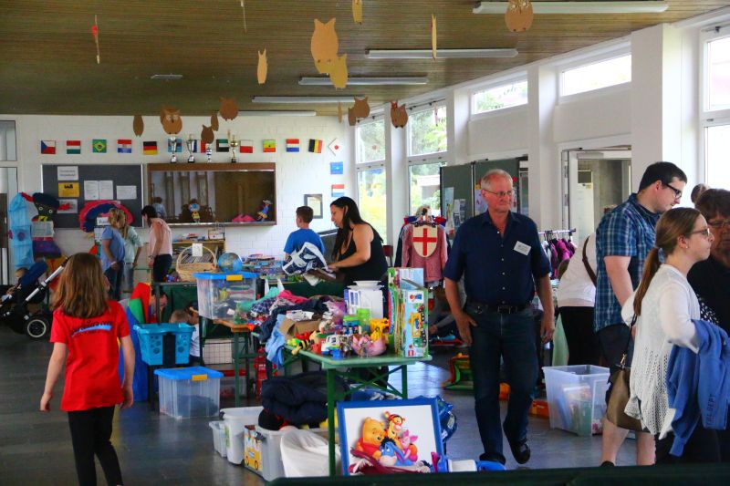 Um halb zwei Uhr nachmittags sah es alles andere als gut aus: dunkle Wolken zogen am südlichen Landkreis-Himmel auf, der sich abzeichnende Schauer ließ nicht lange auf sich warten. Die bereits im Außenbereich der Ilmmünsterer Grundschule aufgebauten Tische für den Kinderflohmarkt mussten demnach schnellstens in die Aula verlagert werden, so konnte der Verkauf wenigstens dort im Trockenen durchgeführt werden.