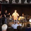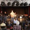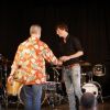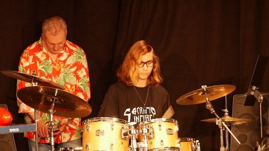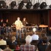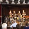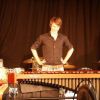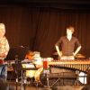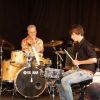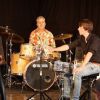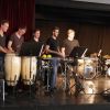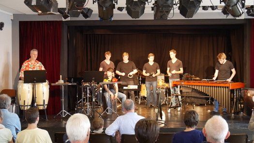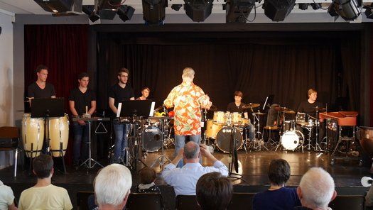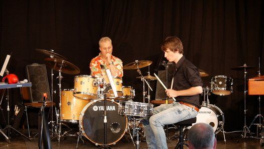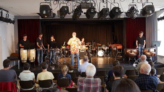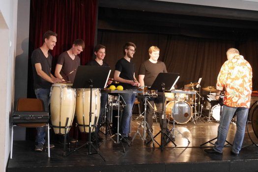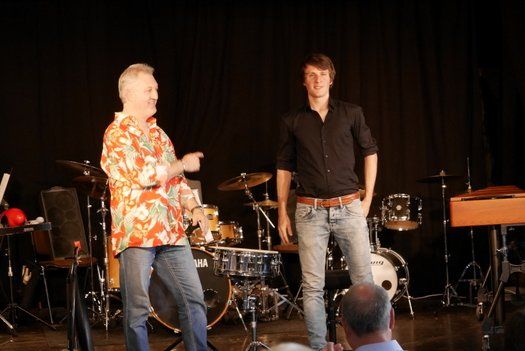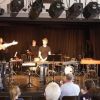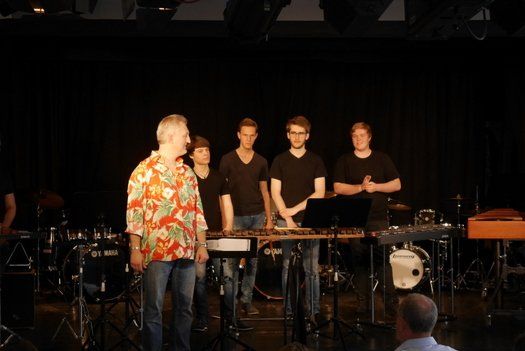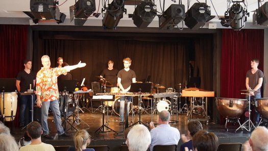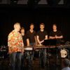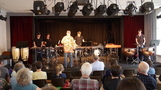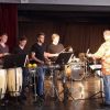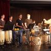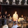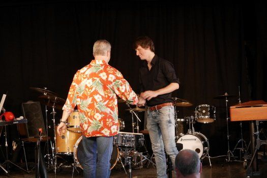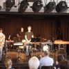 Fünf Schüler halfen dem großen Meister der Trommeln in verschiedensten Formationen bei dem lautstarken Vorspiel. In der Gruppe oder als Solisten, nach Noten oder aus dem Kopf, mit einer Art „playback“ ohne Schlagzeug, zu dem passend zu spielen war, die Schüler präsentierten perfektes Timing. Mit Michael Leopold stieß später noch ein wahrer Meisterschüler von Arno Haselsteiner zu der Gruppe.