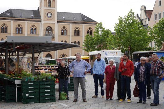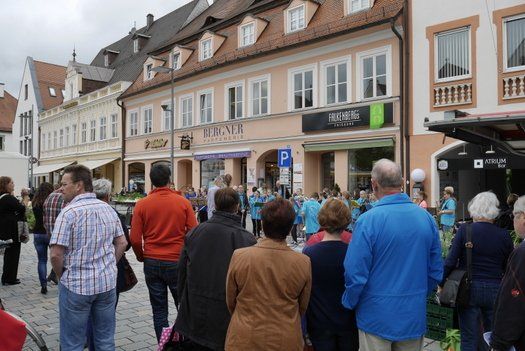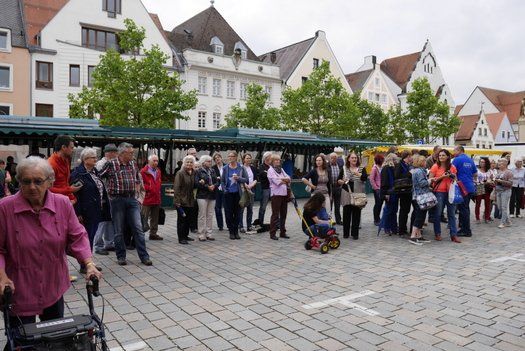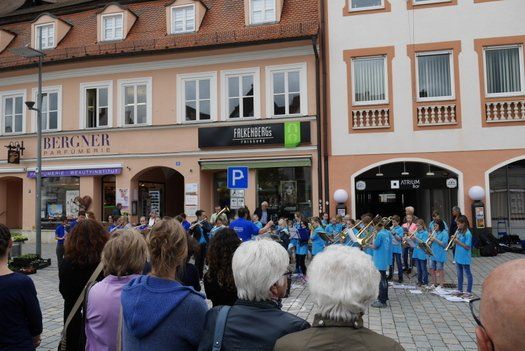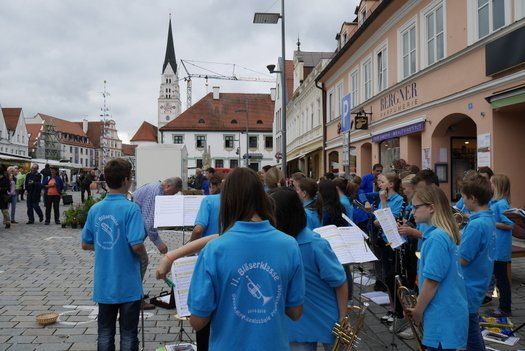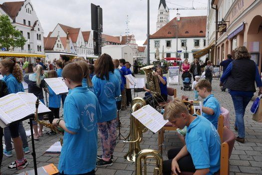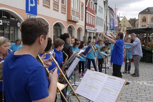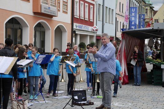 Vom Star-Wars-Thema bis zum Zwiefachen, einem spontanen Geburtstagsständchen bis zu den Landeshymnen mit Gesang hatten die Schüler alles in petto. Applaus gab es von den Besuchern des Wochenmarktes genug und die kleinen Spendenkörbchen füllten sich auch, das eine oder andere Belohnungseis war sicher drin. Elmar Schröck war sichtbar gerührt, die Pensionierung wartet unerbittlich, und seine Bläser werden ihm sicher fehlen. Wie viele werdende Musiker durch seine gestrenge Ausbildung gegangen sind, ist nicht wichtig, die, die an diesem Tag spielten, waren sicht- und hörbare Belohnung genug. Den Gästen hat es auch gefallen, und wie das Projekt mit Hilfe der städtischen Musikschule in Zukunft weitergehen soll, erfahren sie an dieser Stelle.