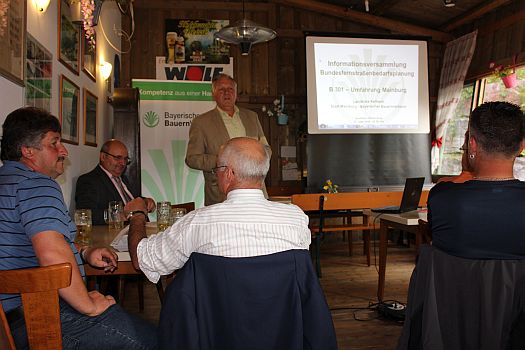 Die Bundesstraße 301 als Hauptverkehrsstraße weist mit täglich mehr als 8 000 Fahrzeugen nämlich ein überdurchschnittlich hohes Verkehrsaufkommen auf. 1. Bürgermeister Josef Reiser, indes selbst betroffen von der Trasse da sein Haus ca. 100m entfernt liegt, argumentierte jedoch klipp und klar für die Umgehungsstraße. Entgegen aller Anfechtungen versuchte er den Leuten begreiflich zu machen, dass der Bedarf einer solchen Umgehungsstraße tatsächlich gegeben ist. „Nach derzeitiger Lage und mit Blick auf die Zukunft ist die Maßnahme absolut begrüßenswert“, so der Bürgermeister. Er verwies auf den langen Realisierungszeitrum, der mit 2030 noch weit entfernt liegt. „Zumindest die Chance eines Planungsverfahrens möchte ich keinesfalls versäumen“, so Reiser weiter.