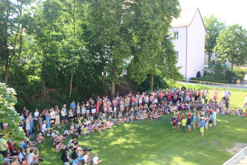 Unter den Anwesenden konnte Rektorin Dorothee Binapfl unter anderem auch Scheyerns Bürgermeister Manfred Sterz mit Familie sowie die 2. Bürgermeisterin Dr. Katja Limpert begrüßen; "Musik verbindet" - dieses Motto galt für die Grundschule Scheyern nicht nur auf dem Papier, sondern wurde über der Einladung zur Teilnahme der im benachbarten ehemaligen Mannschaftsquartier der Kaserne untergebrachten Flüchtlinge auch praktiziert.