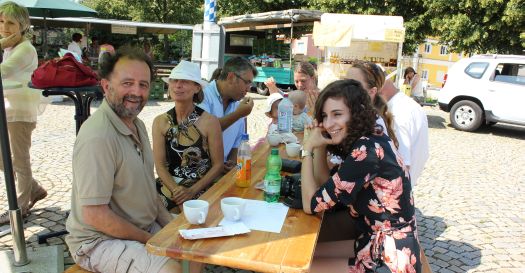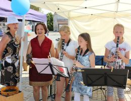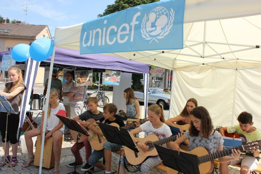 Am Grünen Markt diesen Samstag unterhalt dieses Mal das UNICEF-TEAM auf Initiative von Elisabeth Krojer. Interessierte bekamen außerdem Informationen zur Arbeit der weltweiten Kinderhilfsorganisation. Während sich die einen an den Marktständen mit frischem Obst, Gemüse und anderen Spezialitäten aus der Region eindeckten, ließen sich die anderen von den internationalen Liedern der Musikschüler von Elisabeth Krojer unterhalten. Strahlender Sonnenschein begleitete die Aktion und so nutzten viele gleich die Gelegenheit unter den Sonnenschirmen zu verweilen und dabei das ein oder andere Tässchen Kaffee und Stückchen Küchen zu kosten durch dessen Verkauf am Ende eine stattliche Spendensumme erzielt werden konnte.