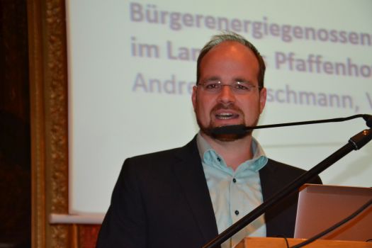 Andreas Herschmann, Vorstandsvorsitzender der Bürgerenergiegenossenschaft nutzte die Gelegenheit, als Antragsteller der Windräder auf die Ziele der Genossenschaft und die technischen Punkte der Anlagen einzugehen, dabei stand sein Vortrag unter dem Motto "Soviel wie nötig, so wenig wie möglich". Der Antrag für 3 WKA sei am 6.5.2016 bei der Stadt eingereicht worden, obwohl der Teilflächennutzungsplan Windenergie noch sieben Windräder zulasse, und der Bauausschuss der Stadt habe die Aufstellung eines Bebauungsplanes beschlossen. Es sei eine Leistung von 9 kW durch die Anlagen zu erwarten, wobei je Windrad gut 2500 Haushalte mit Strom versorgen könnten. Bei den derzeitigen erneuerbaren Energieanlagen der Bürgergenossenschaft würden schon 6400 Haushalte mit Strom versorgt. Außerdem haben die Windräder (Nabenhöhe 159 m) getriebelose Rotoren, die bei hörbarem Schall die Grenzwerte unterschreiten sowie keinen Infraschall verursachen würden, und die Rotorblätter (Durchmeser 141 m) seien beheizt, so dass kein Eiswurf entstehen könne. Außerdem hätten die Windräder eine eingebaute Sensorik, die Schattenwurf durch Abschaltung verhindere. Zudem würden die benötigten Waldflächen nach den Arbeiten an den Windrädern wieder aufgeforstet – jeder gefällte Baum werde ersetzt.