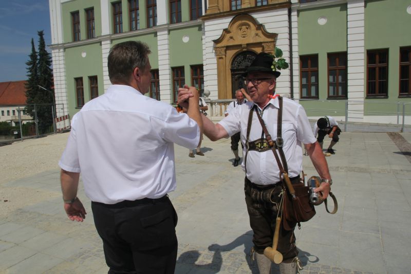 Nein, noch is noch nicht o'zapft! Dennoch hätte man das durchaus denken können, denn die Burgschützen schossen Salut, aber nicht um das Hallertauer Volksfest einzuläuten, sondern um Bürgermeister Jens Machold zu gratulieren.