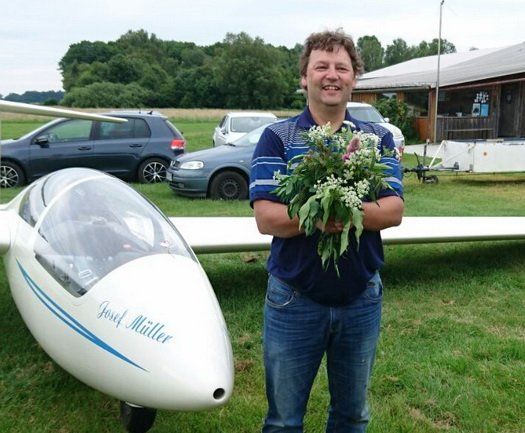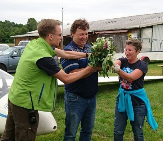 Nach der Landung war Andreas die Freude anzusehen. Er hatte lange für diesen Moment gekämpft und nun war es endlich soweit. Die anderen Piloten und Flugschüler eilten zu ihm, um ihm zu gratulieren und alles Gute zu wünschen. Dann wurde, gemäß der Tradition unter Segelfliegern, der "Hinterteil für die Thermik sensibilisiert" und ein Strauß überreicht, der das Gefühl für den Knüppel im Flugzeug stärken soll.