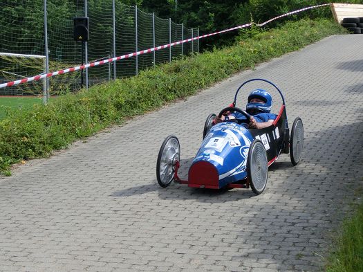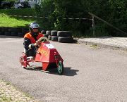 Nach 2 Probeläufen wurde es ernst: Die Starter machten sich nacheinander auf die kurze, aber durchaus steile und kurvenreiche Strecke, einer von ihnen, ein junger Bub, schleuderte bereits in der 2. Kurve, die Vorderachse brach und in der 3. Kurve überschlug er sich seitlich. Gottseidank hatte er den Helm sicher auf, es passierte ihm nichts.