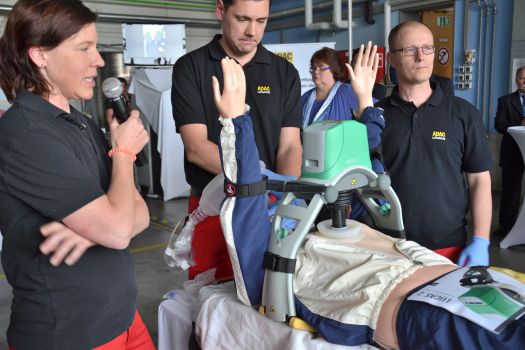 Thomas Burkhardt betonte, dass die 37 ADAC-Rettungsstationen sukzessive mit neuen Hubschraubern ausgerüstet werden. Alle Stationen fliegen zusammen über 50.000 Einsätze im Jahr; seit Beginn der ADAC-Luftrettung über 800.000. Über 150 Mio. Euro läßt sich der ADAC die Neuanschaffung der Hubschrauber kosten, was aber zum Wohle der Patienten gut investiertes Geld sei. Andreas Estenmeier von der integrierten Leitstelle des BRK ging auf die Qualifikation der Rettungsassistenten und Notfallsanitäter ein, wobei letztere eine 3-jährige Ausbildung, die Rettungssanitäter eine 2-jährige Ausbildung hätten, aber auf jeden Fall für die Rettungseinsätze qualifiziert seien. Unter Anleitung von Dr. Andrea Günes demonstrierten die Sanitäter den Einsatz des Reanimationsgerätes LUCAS, das im Hubschrauber bei Notfällen eingesetzt wird.