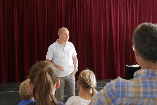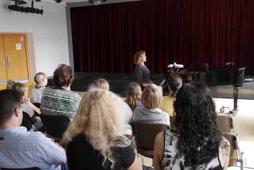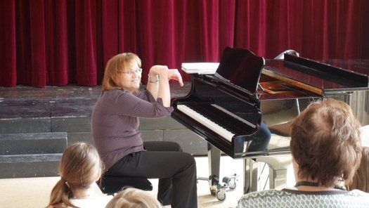 Auwi Geyer, Leiter der Städtische Musikschule Pfaffenhofen, hält eine kurze Einführungsrede an die neugierigen Besucher und überlässt dann Irina Kersting das Wort. Wie wichtig allein schon die Haltung vor dem Instrument, die Höhe des Sitzes und besonders die Spannung in den Armen beim ersten Anschlag ist, erklärt uns die Dame mit russischen Wurzeln als erstes.