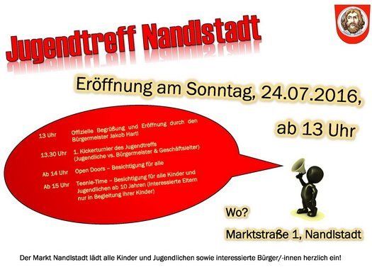 Die Eröffnung des Jugendtreffs beginnt am Sonntag, 24. Juli 2016, um 13 Uhr mit der Begrüßung durch den Bürgermeister Jakob Hartl und der anschließenden Segnung der Räume durch Pfarrer Stephan Rauscher. Um 13.30 Uhr gibt es das erste offizielle Kickerturnier des Jugendtreffs, in dem Bürgermeister und Geschäftsleiter gegen die Jugendlichen antreten. Ab 14 Uhr stehen die Räume allen Interessierten zur Besichtigung frei, ab 15 Uhr dann nur noch ihren zukünftigen Gästen (alle Jugendlichen ab 10 Jahren) und deren. Der Markt Nandlstadt lädt alle Kinder und Jugendlichen sowie interessierte Bürger/-innen sehr herzlich ein!