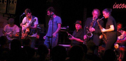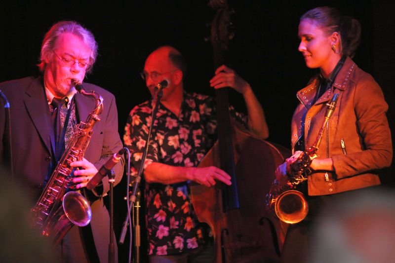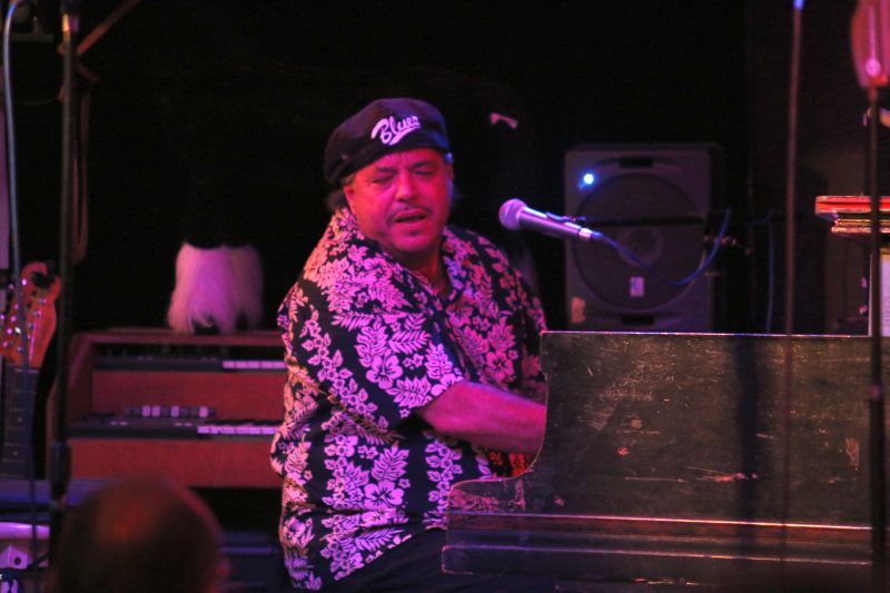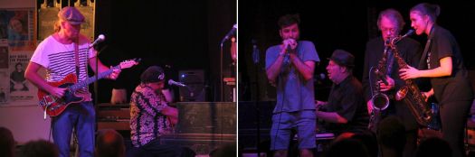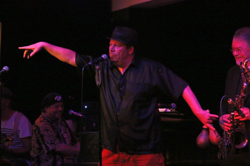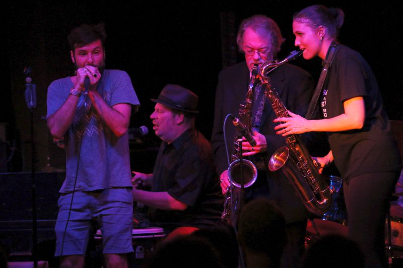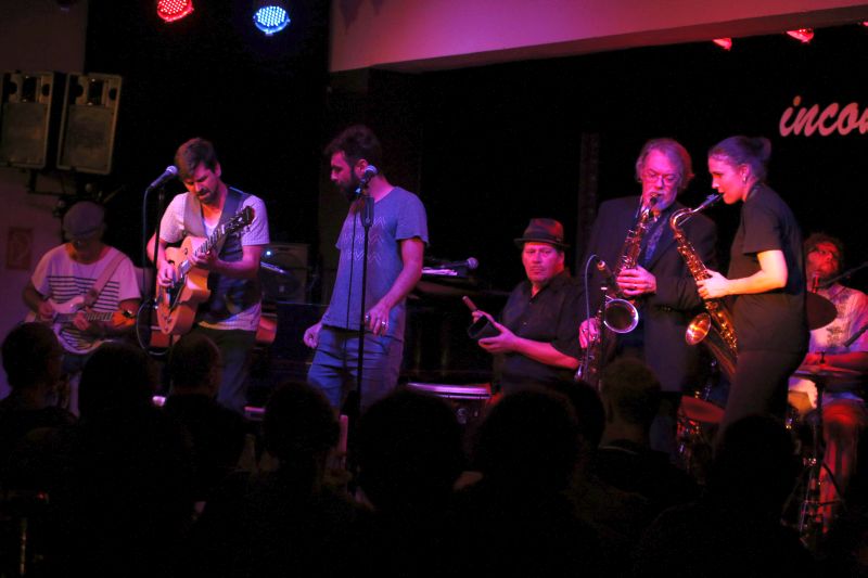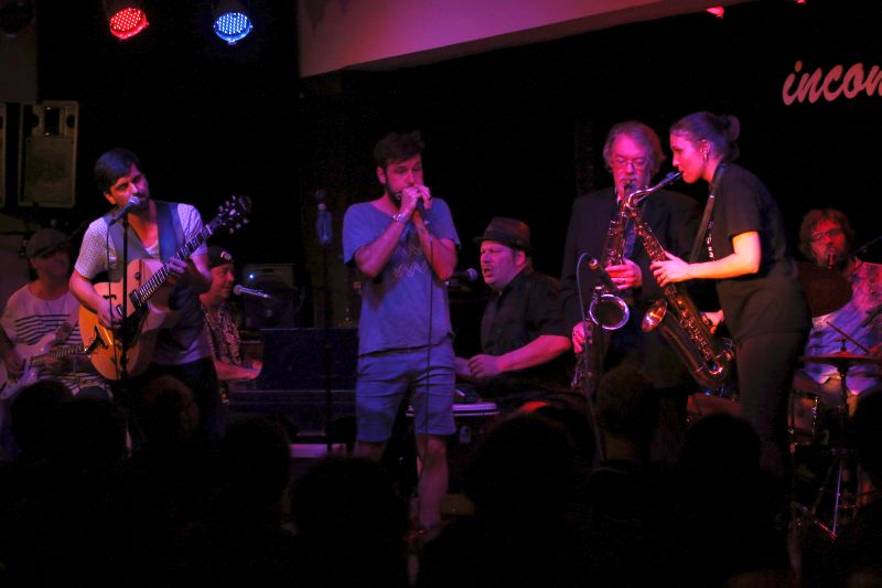 Nicht weniger als 9 Musiker drängelten sich auf der für ein solches Ensemble viel zu kleinen Bühne. Schlagzeuger Peter Oscar Kraus und Bassist Alexander Haas hatten wahrscheinlich gar keinen Blick mehr auf das Publikum. Vor ihnen standen mit Michael Außerbauer und Sara Gallitz die "Sax & Drugs & Rock'n'Roll"-Bläser-Fraktion und Dr. Will, das Münchener Unikum mit diversen Percussions und Rhythmus-Instrumenten. Christian Willisohn nahm auf dem Klavierhocker Platz, neben ihm Mr. Blues himself, Peter Schneider an der Gitarre. Als dann nach der Pause noch Entertainer, Sänger und Mundharmonika-Spieler San2 sowie sein Soul Patrol-Gitarrist Sebastian Schwarzenberger die Bühne enterten, war das Nonett = "Gruppe von neun Ausführenden" (Wikipedia) perfekt. Sie seien eigentlich zufällig auf der Fahrt von München nach Ingolstadt vorbei gekommen, hörten Musik aus den offenen Toren der KulturWerk-Halle und konnten nicht umhin mitzumachen.