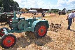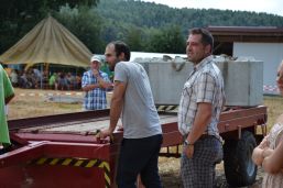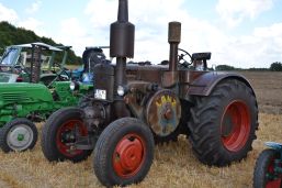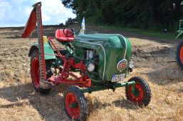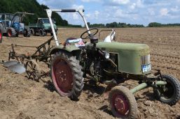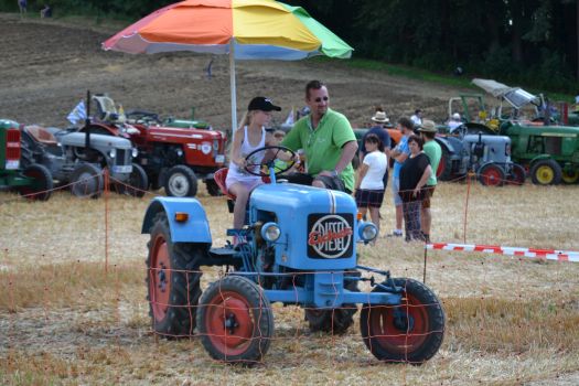 Und wie es sich so auf dem Acker gehört, wurde erst einmal eine deftige Brotzeit gemacht, die herein kommenden Traktoren begutachtet, Daten ausgetuscht und alte Freunde begrüßt - denn viele kennen sich durch ihr Hobby und haben sich schon bei so manchem Bulldog-Treffen gesehen. Aber es gibt halt doch immer wieder Neues zu entdecken oder zu berichten. Der nächste Punkt des Vormittags war der Ackertag. Da wurden die alten Pflüge und Eggen angespannt und das riesig große Feld umgepflügt und geeggt. Im Wechsel setzten sich zehn Traktorfahrer mit ihren Bulldogs und angehängten Gerätschaften in Bewegung und hatten in zwei Stunden das Feld gepflügt. Wenn man dann bedenkt, dass so noch vor 40 bis 50 Jahren mit den alten Maschinen gearbeitet wurde, kann man sich heute gar nicht mehr vorstellen, wie lange ein Bauer damals noch mit Pferd oder Ochse vor dem Pflug zu arbeiten hatte. Die heutigen Traktoren schaffen diese Arbeit inzwischen deutlich schneller als zu Großvaters Zeiten. Nach dieser anstrengenden Arbeit bei glühender Hitze hieß es dann erstmal "ein kräftiges Mittagessen und ein Bier", denn das hatten sich nicht nur die Bulldogfahrer verdient, auch die vielen Zuschauer, von denen im Laufe des Tages mehrere Hunderte den Acker besuchten, dabei waren natürlich auch viele KInder, die sehr interesssiert waren am alten technischen Gerät. Und extra für Kinder hatten die Agrar Oldies auch einen kleinen Traktor-Parcours eingerichtet, auf dem kleine Jungen und Mädchen in Begleitung eines Erwachsenen einen Traktor lenken durften, dabei ging es nicht nur darum, alle Kurven richtig anzusteuern, sie mussten auch über eine Wippe fahren.