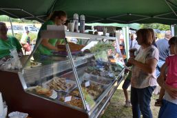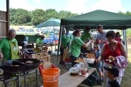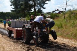 Der nächste Punkt des Nachmittags sollte zeigen, welcher Bulldog, ob klein oder groß spielte hierbei keine Rolle, in der Lage ist, einen Anhänger mit einem Gesamtgewicht von über 2 to (mit einem 1,8 to schweren Betonstein), einen leichten Anhang hinauf zu ziehen. Man hätte meinen können, die Traktoren mit den größten Rädern würden das locker schaffen, doch auch hier mussten die Fahrer zum Teil aufgeben; teilweise hoben sich sogar die Vorderräder der Bulldogs, was ein deutliches Zeichen dafür war, dass nichts mehr ging. Die schwere Anhängerlast wurde dann von einem Radlader immer wieder auf die Ausgangsposition zurückgeschoben und dabei die Fahrtstrecke von gut 100 Metern wieder planiert, damit jeder der Traktorfahrer die gleichen Bedingungen hatte. Dieses Event lockte natürlich die meisten Zuschauer an, die sich vom Start- bis zum Zielbereich aufgestellt hatten. Viele der Besucher und Agrar OLdies nutzten zwischendurch immer mal wieder den Schatten unter der Zeltplane bzw. dem Fallschirm, um etwas zu trinken oder sich Kaffee und Kuchen zu gönnen. Die Helfer hinter den Theken hatten auf jeden Fall immer genug zu tun.