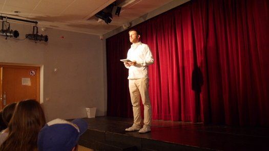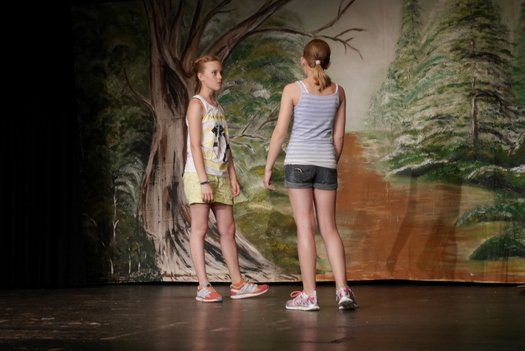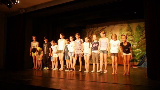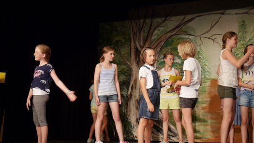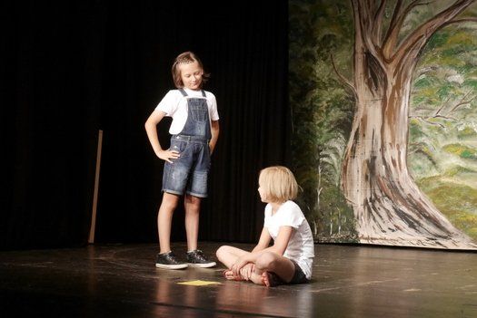 Beim ersten Stück „Die Streithähne“, das unter der Regie von Fabian und Birgit komplett selbst erstellt wurde, viel leider kurzzeitig ein Mitglied aus und die Kinder mussten mit nur einer Stellprobe auf die Bühne. Zwei Klassen, die sich nicht unbedingt grün sind, fahren zusammen in ein Zeltlager und müssen nun zwangsläufig zusammenarbeiten. Bei zahlreichen Spielsituationen beweisen sie jedoch, dass Zusammenarbeit trotz Konflikt möglich ist.