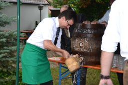 Eine kurze Regenpause wurde von allen dann genutzt, um auf schnellstem Wege ins Vereinsheim "Post" zu gelangen. Vorweg die Pörnbacher Blaskapelle, dahinter die verschiedenen Vereine mit ihren Fahnen und die Feuerwehren. Am Festplatz angekommen, schlüpften die Gäste schnell auf die Bänke in den aufgestellten Festzelten und Vorsitzender des KSK, Stephan Fink, begrü0ßte die Gäste. Bürgermeister Helmut Bergwinkel hatte die Ehre, das Bierfass anzustechen, was auch mit zwei Schlägen gelang. In seiner Rede ging Stephan Fink auf die 150-jährige Geschichte des Vereins ein, der 1866, also noch vor dem großen deutsch-französischen Krieg, gegründet und unter den Nazis 1934 verboten wurde; erst 1951 wurde der verein wiederbelebt und ist damit der älteste Verein Pörnbachs mit derzeit 145 Mitgglieder, dabei stand der Verein, als sich vor einigen Jahren niemand für den Vorstandsposten bereit fand, einmal kurz vor der Auflösung. Doch das ist Geschichte, heute steht der Verein gut da.