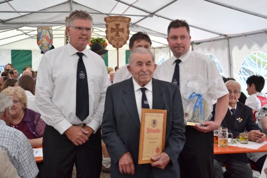 Bürgermeister Helmut Bergwinkel ging in seiner Ansprache darauf ein, weshalb es wichtig sei, den KSK zu unterstützen, unter anderem deshalb, weil dieser Verein immer wieder daran erinnert, dass Krieg keine Lösung ist, der Verein die Gefallenen ehrt und traditionelle Werte vermittelt. Abschließend gab es eine Ehrung für Simon Reisinger, der seit 60 Jahren Mitglied des Krieger-, Soldaten- und Kameradenbudes ist. Vor dem anschließenden gemeinsamen Mittagessen gab es das Tischgebet durch Pater Pureiner.