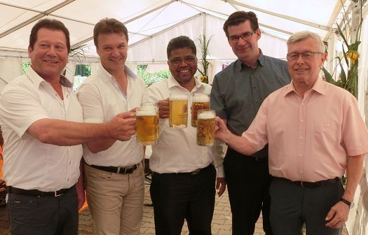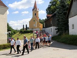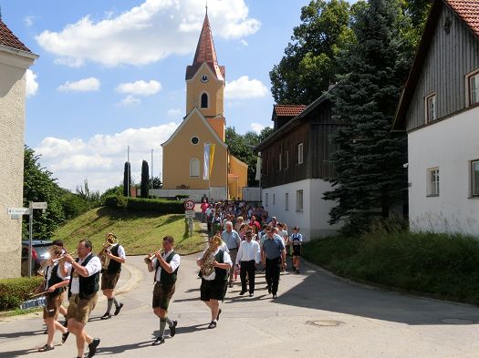 Die "Holledauer Biefescheißer" führte den Zug musikalisch an, gefolgt von Bürgermeister Karl Ecker neben dem Vertretungspfarrer Pater Christopher und Pfarrgemeinderatssprecher Peter Wittmann. Dieser begrüßte in einer launigen Rede die vielen, auch auswärtigen Anwesenden (von den 400 vorbereiteten Plätzen blieb kaum einer leer), und bedankte sich bei den vielen Helfern und Sponsoren, die zum Gelingen des alljährlichen Pfarrfestes beitragen. Eine große Freude bereite ihm heuer die gelungene Außenrenovierung der Osterwaaler Kirche, der zweite Teil, nämlich die Innenrenovierung sowie die Friedhofsmauer, folgen anschließend: "Nächstes Jahr steht unser Kirch wia neu da - des versprich i eich!", so Wittmann.